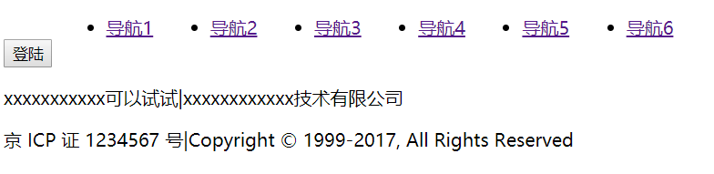 <%@ page language="java" contentType="text/html; charset=UTF-8" pageEncoding="UTF-8"%> <div> <p>xxxxxxxxxxx可以试试|xxxxxxxxxxxx技术有限公司</p> <p>京 ICP 证 1234567 号|Copyright © 1999-2017, All Rights Reserved </p> </div>