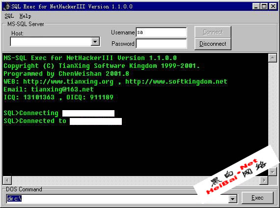 昨天晚上,朋友给我一台漏洞颇多的主机,哈哈,我没别的意思,只是练一下手而已,顺便把过程写下来,这台主机的漏洞实在多,CGI漏洞就30多个,SQL的sa这个用户的密码为空,开的端口12个,这台主机是100M的宽带,用来做“轰炸鸡”不错,一看这个网站,靠,居然是文化信息网,不敢打歪主意了,先进去看看,打开SqlExec.exe,这是连接数据库用的工具,收藏在“黑客入侵必备工具包”(下载地址http://www.sangel.net)里,在HOST那里填上对方IP,用户名为sa,密码为空就不用填,然后点Connnect就开始连接了,如图: