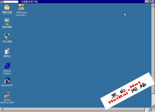 就这样就激活了guest这个帐号,并把它的密码设为521521,还添加进管理员组,如果帐号本来就是的活的,就直接输入倒数两行命令就可以了,别忘了,如果目标主机没有开23端口的话,记得为它运行远程登陆服务,输入:net start telnet。现在我们有管理员帐号了,想做什么还不随心所欲?这台主机还开了3389端口,赶快用“终端服务客户端”(收藏在“黑客入侵必备工具包”里面),连接上去,就像操作自己的电脑一样,如下图: