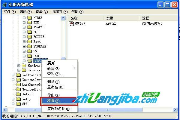 2、3、4处要修改权限为“完全控制”,方法是,右键选中USBSTOR,选中“权限”,在弹出的对话框的everyone的“完全控制”打个勾,然后点击“应用”和“确定”,就可以对其进行删除操作。如图: