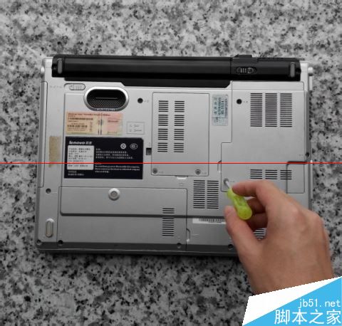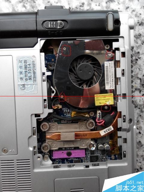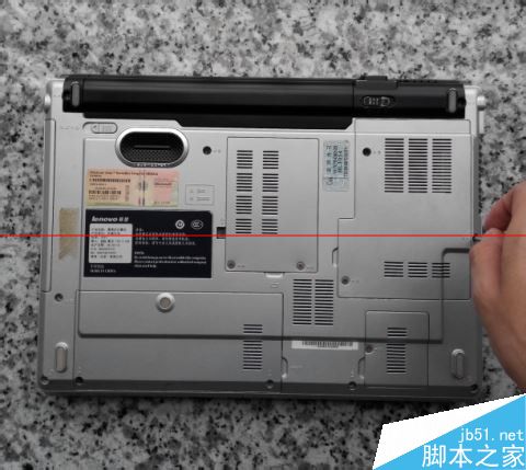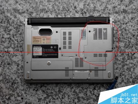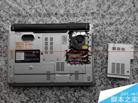第一步,将笔记本电脑翻到后盖,可以看到红线圈住的那一块位置,那里就是F41的风扇位置所在。