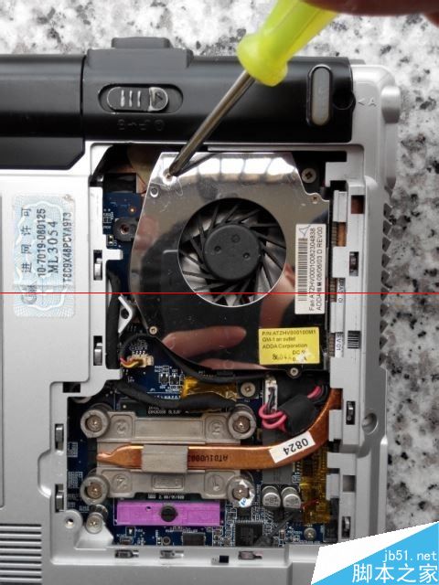 使用小型螺丝刀将银色铝片上的固定螺丝取出,便可以看到整个脏兮兮的风扇。