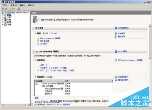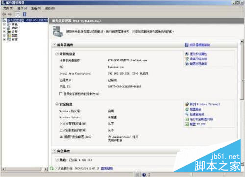 启动服务器管理器点击开始菜单->所有程序->管理工具->服务器管理器,启动服务器管理器,界面如下: