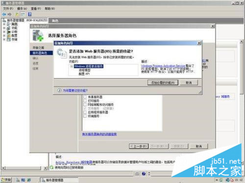依赖于Windows进程激活服务(WAS)的Web服务器角色 添加角色向导会针对任何需要的依赖关系向你提示;由于IIS依赖Windows进程激活服务(WAS),因此会出现下面的信息对话框。点击添加必需的功能,然后继续。Web服务器现在已经被选择进行安装,选择角色对话框。点击下一步,出现Web服务器简介窗口,点击下一步。