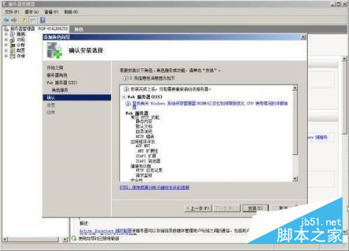 确认安装 确认选择安装的服务种类和设置,如果有问题则点击上一步继续进行修改设置,如果没问题则可以开始安装。点击确认后,系统自动开始安装IIS 7.0,安装完成后会给出安装结果信息。
