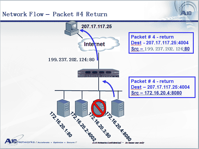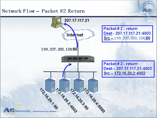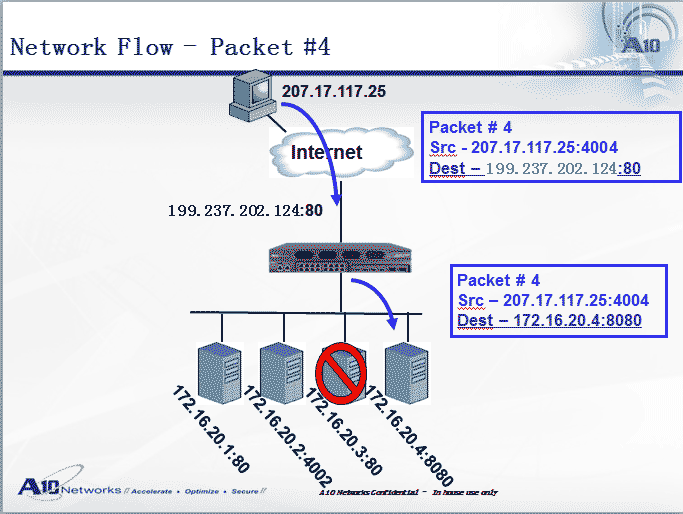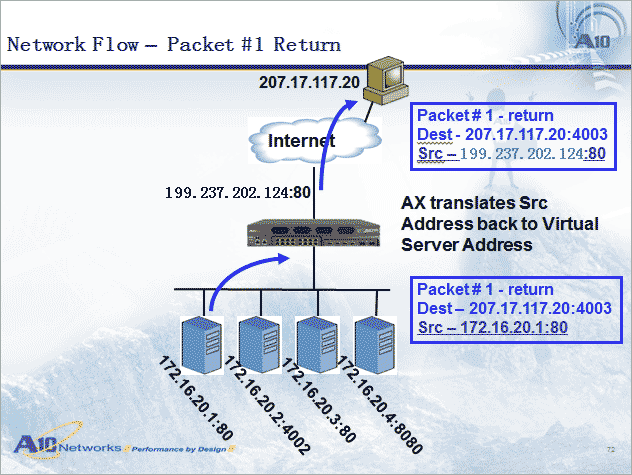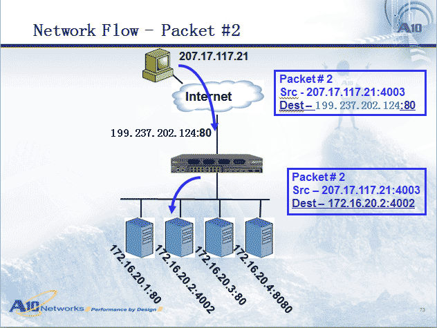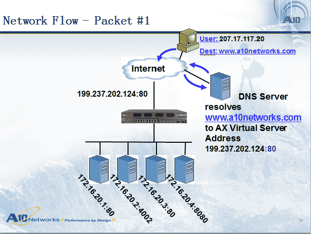 用户(IP:207.17.117.20)访问域名www.a10networks.com,首先会通过DNS查询解析出这个域名的公网地址:199.237.202.124,接下来用户207.17.117.20会访问199.237.202.124这个地址,因此数据包会到达负载均衡设备,接下来负载均衡设备会把数据包分发到合适的服务器,看下图: