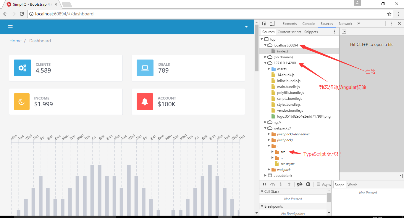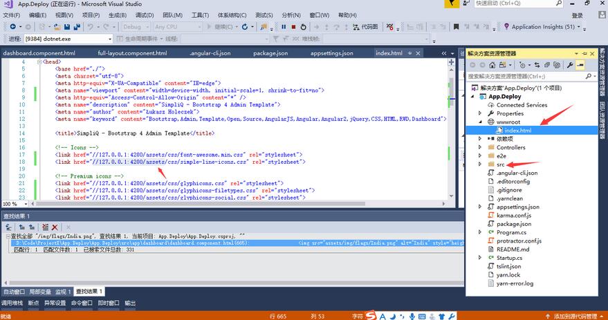 在开始项目调试之前,我们需将angular资源中的index.html移入wwwroot中,需注意,此index.html文件需是由ng build命令生成的版本,一般存储在/dist目录中