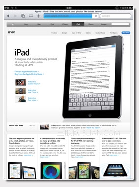 iPad 搭载的是Safari浏览器,大触摸屏可以方便冲浪,整个页面可以一次呈现,通过手指在屏幕上便可进行翻页、滚动,也可对相片进行放大缩小操作,支持网页 缩略,体验更为直观。