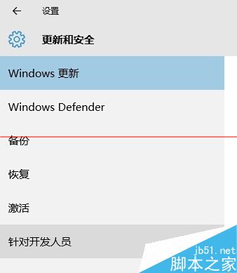 在进入“更新与安全”设置面板中,点击左侧的“针对开发人员”,来进入开发人员选项面板。