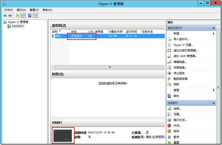 在群集管理器中创建好高可用虚机VM001后,现在虚机落在Node01节点上。