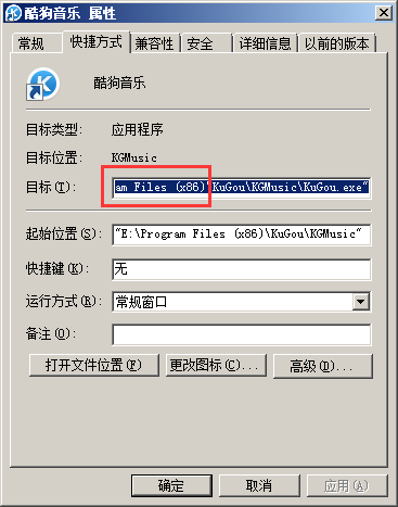 第二步、查看看软件的安装路径,在软件属性界面,查看“目标”选项后面,看软件安装在哪一个文件夹,如下图所示,安装在Program Files (x86)文件夹就是32位软件;安装在Program Files文件夹的软件就是64位软件