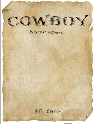 4、选取“横排文字工具”,字体样式及大小根据自己喜好进行调整,输入“COWBOY”,“horse opera”,"$5 fare",然后栅格化处理,按Ctrl+E进行合并;
