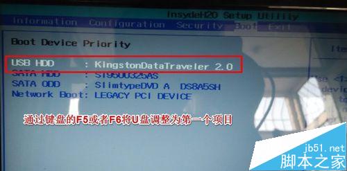 我们要通过键盘的F5或者F6将我们的U盘调整为第一启动项目。