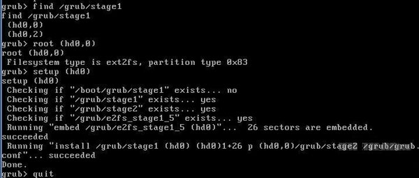 grub》 root (hd0,0) //首先find /grub/stage1查看/boot分区为(hd0,0)