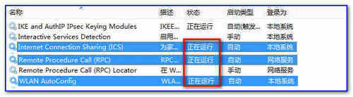 可右击桌面“计算机”图标,依次打开“管理”---“服务和应用程序”---“服务”(或同时按下“windows键和R键”,输入“services.msc”,点击确定打开“服务管理器”),查看“Internet Connection Sharing (ICS)”和“Remote Procedure Call (RPC)”服务是否启用。若“手动”未“正在运行”,在相应服务右击选“启动”;若“禁用”,相应服务处右击选“属性”,“启动方式”设置为“自动”,点击“应用”按钮,点击“启动”,再点击“确定”,完成设置。
