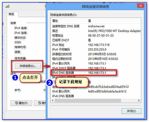 5. 若手机端QQ可以收发消息,但是无法打开网页,其他应用不能联网,可能电脑系统DNS服务功能异常,可在“更改适配器设置”中的“以太网”或“宽带连接”(具体情况视所使用联网方式)右击选择“状态”,点击“详细信息”,记录下“IPv4 DNS”信息,手机网络设置里手动设置“DNS服务器”(域名)地址。具体设置方法详见手机厂商提供的使用说明。
