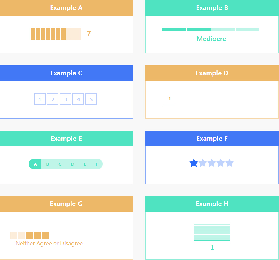 <head> <meta charset="gb2312"> <meta http-equiv="X-UA-Compatible" content="IE=edge,chrome=1"> <title>8款超赞的jQuery评分插件</title> <meta name="description" content=""> <meta name="viewport" content="width=1024"> <link rel="stylesheet" href="css/normalize.min.css"> <link rel="stylesheet" href="css/main.css"> <link rel="stylesheet" href="css/examples.css"> <!--[if lt IE 9]> <script src="js/vendor/html5shiv.js"></script> <![endif]--> </head> <body> <section class="section section-examples"> <div class="examples"> <div class="row"> <div class="col"> <div class="box box-orange"> <div class="box-header">Example A</div> <div class="box-body"> <select id="example-a" name="rating"> <option value="1">1</option> <option value="2">2</option> <option value="3">3</option> <option value="4">4</option> <option value="5">5</option> <option value="6">6</option> <option value="7" selected="selected">7</option> <option value="8">8</option> <option value="9">9</option> <option value="10">10</option> </select> </div> </div> </div> <div class="col"> <div class="box box-green"> <div class="box-header">Example B</div> <div class="box-body"> <select id="example-b" name="rating"> <option value="Bad">Bad</option> <option value="Mediocre">Mediocre</option> <option value="Good" selected="selected">Good</option> <option value="Awesome">Awesome</option> </select> </div> </div> </div> </div> <div class="row"> <div class="col"> <div class="box box-blue"> <div class="box-header">Example C</div> <div class="box-body"> <select id="example-c" name="rating"> <option value=""></option> <option value="1">1</option> <option value="2">2</option> <option value="3">3</option> <option value="4">4</option> <option value="5">5</option> </select> </div> </div> </div> <div class="col"> <div class="box box-orange"> <div class="box-header">Example D</div> <div class="box-body"> <select id="example-d" name="rating"> <option value="1" data-html="<strong>1</strong>">1</option> <option value="2" data-html="<strong>2</strong>">2</option> <option value="3" data-html="<strong>3</strong>">3</option> <option value="4" data-html="<strong>4</strong>">4</option> <option value="5" data-html="<strong>5</strong>">5</option> <option value="6" data-html="<strong>6</strong>">6</option> <option value="7" data-html="<strong>7</strong>">7</option> <option value="8" data-html="<strong>8</strong>">8</option> </select> </div> </div> </div> </div> <div class="row"> <div class="col"> <div class="box box-green"> <div class="box-header">Example E</div> <div class="box-body"> <select id="example-e" name="rating"> <option value="A">A</option> <option value="B">B</option> <option value="C">C</option> <option value="D">D</option> <option value="E">E</option> <option value="F">F</option> </select> </div> </div> </div> <div class="col"> <div class="box box-blue"> <div class="box-header">Example F</div> <div class="box-body"> <select id="example-f" name="rating"> <option value="1">1</option> <option value="2">2</option> <option value="3">3</option> <option value="4">4</option> <option value="5">5</option> </select> </div> </div> </div> </div> <div class="row"> <div class="col"> <div class="box box-orange box-large"> <div class="box-header">Example G</div> <div class="box-body"> <select id="example-g" name="rating"> <option value="Strongly Agree">Strongly Agree</option> <option value="Agree">Agree</option> <option value="Neither Agree or Disagree" selected="selected">Neither Agree or Disagree</option> <option value="Disagree">Disagree</option> <option value="Strongly Disagree">Strongly Disagree</option> </select> </div> </div> </div> <div class="col"> <div class="box box-green box-large"> <div class="box-header">Example H</div> <div class="box-body"> <select id="example-h" name="rating"> <option value="10">10</option> <option value="9">9</option> <option value="8">8</option> <option value="7">7</option> <option value="6">6</option> <option value="5">5</option> <option value="4">4</option> <option value="3">3</option> <option value="2">2</option> <option value="1" selected="selected">1</option> </select> </div> </div> </div> </div> </div> </section> <script src="js/vendor/jquery-1.11.2.min.js"></script> <script src="js/jquery.barrating.js"></script> <script src="js/examples.js"></script> <div style="text-align:center;margin:50px 0; font:normal 14px/24px 'MicroSoft YaHei';"> </div> </body> </html>