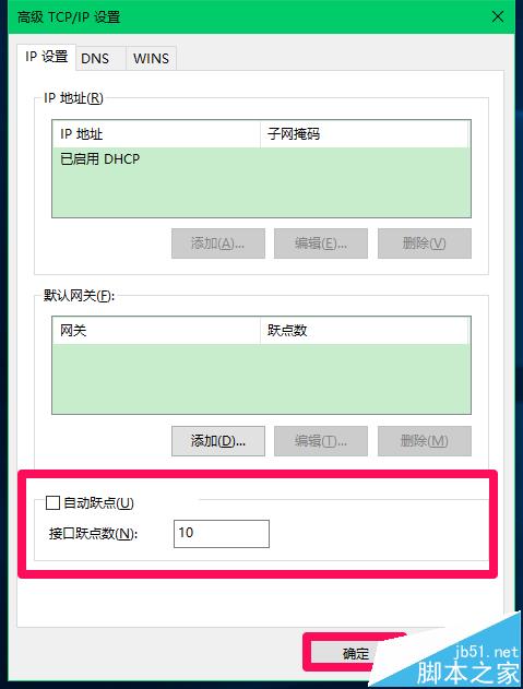 8、点击去勾后,在接口跃点数(N)栏中输入:10(跃点数为10,网络连接速度大于200MB),点击:确定;