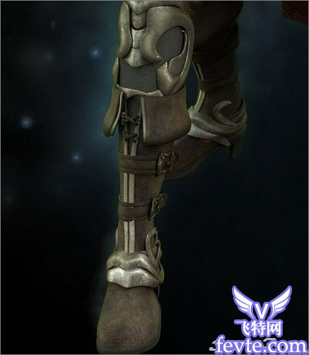 我用的是多边形建模。先做身体跟头部的一半,然后添加一个对称修改器和一个turbosmooth。我用一个平面来建盔甲,然后根据我的稿图通过剪切和连接来完成,接着用一个壳来增加厚度。腰带跟皮带也是用同样的方法。头发是用平面跟不透明贴图完成的。眉毛跟睫毛也是。我认为这样比毛发更快!