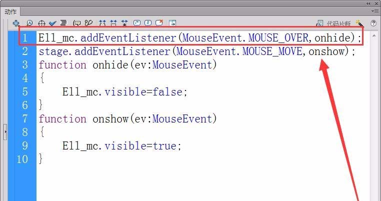 5、首先,注册对象Ell_mc鼠标移入事件的侦听器,接收者函数为onhide。