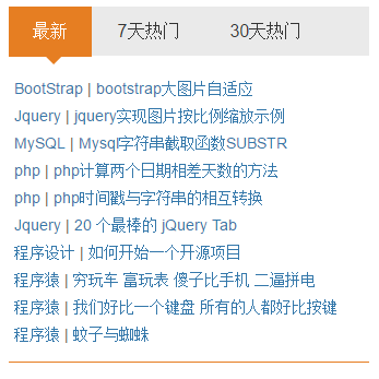 <div class="tab" role="tabpanel"> <!-- Nav tabs --> <ul class="nav nav-tabs" role="tablist" style="margin-top:0px;" id="docTabs"> <li role="presentation" class="active"><a href="#Section_new" aria-controls="home" role="tab" data-toggle="tab"> 最新</a> <li role="presentation"><a href="#Section_week" aria-controls="profile" role="tab" data-toggle="tab">7天热门</a> <li role="presentation"><a href="#Section_month" aria-controls="messages" role="tab" data-toggle="tab">30天热门</a> </ul> <!-- Tab panes --> <div class="tab-content"> <div role="tabpanel" class="tab-pane fade in active" id="Section_new"> <p>