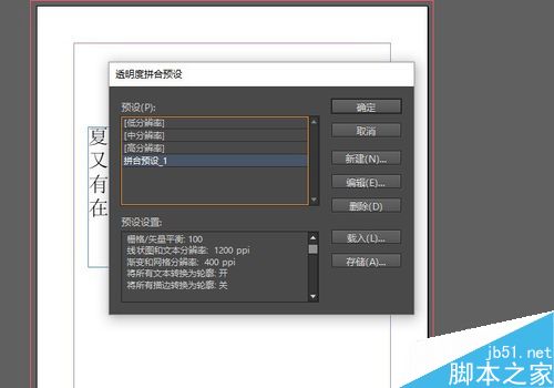 然后来到编辑——透明度预设里面,新建一个预设。按如下参数设置,并将所有文本转换为轮廓选项勾选上。