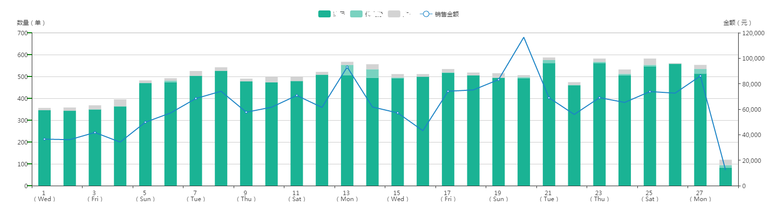 在电商平台中通常会有订单表,记录所有订单信息。现在我们需要统计某个月份每天订单数及销售金额数据从而绘制出如下统计图,进行数据分析。