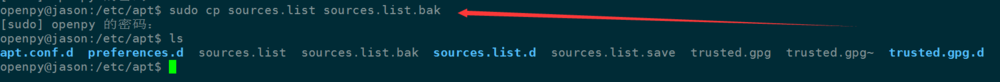 3、备份此目录下的source.list文件(要有sudo权限), 此时就有了一个source.list.bak文件