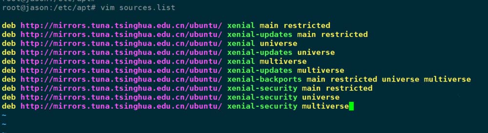 5、用vim 打开source.list, 按i键进入编辑模式 把要修改的源地址粘贴进来, 然后按esc进入命令模式, 键入 :wq保存退出(不懂vim如何操作的可以先百度下如何使用vim)