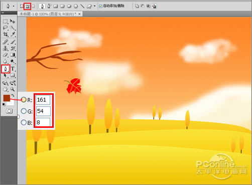 9、在图层面板上单击创建新图层按钮,在工具箱中选择画笔工具,并在工作区绘制出树枝的形状与填充颜色值RGB分别为161、54、8,并调整大小距离,如图11所示。