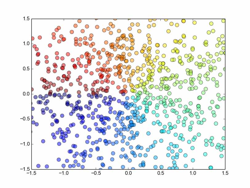 from matplotlib.pyplot import * n = 1024 X = np.random.normal(0,1,n) Y = np.random.normal(0,1,n) T = np.arctan2(Y,X) scatter(X,Y, s=75, c=T, alpha=.5) xlim(-1.5,1.5) ylim(-1.5,1.5) show()