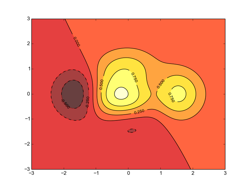 from matplotlib.pyplot import * def f(x,y): return (1-x/2+x**5+y**3)*np.exp(-x**2-y**2) n = 256 x = np.linspace(-3,3,n) y = np.linspace(-3,3,n) X,Y = np.meshgrid(x,y) contourf(X, Y, f(X,Y), 8, alpha=.75, cmap=cm.hot) C = contour(X, Y, f(X,Y), 8, colors='black', linewidth=.5) clabel(C, inline=1, fontsize=10) show()