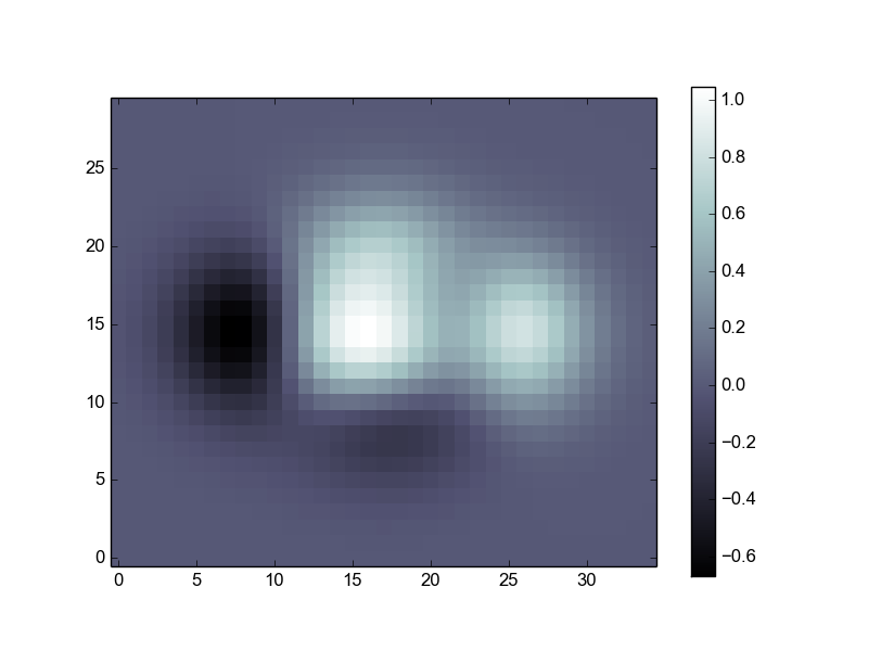 from matplotlib.pyplot import * def f(x,y): return (1-x/2+x**5+y**3)*np.exp(-x**2-y**2) n = 10 x = np.linspace(-3,3,3.5*n) y = np.linspace(-3,3,3.0*n) X,Y = np.meshgrid(x,y) Z = f(X,Y) imshow(Z,interpolation='nearest', cmap='bone', origin='lower') colorbar(shrink=.92) show()