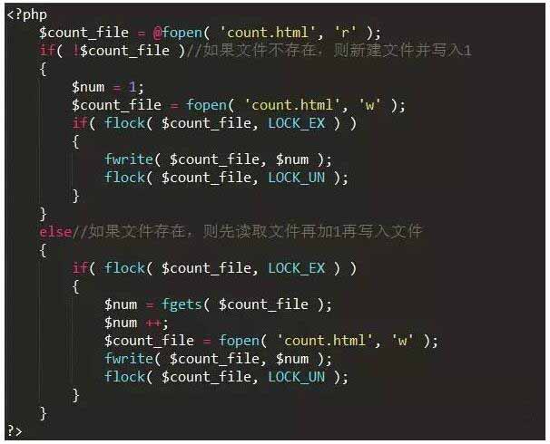 下面我们来看一个实例:统计index.php页面的访问量并写入count.html文件中,统计页面的访问量这件小事儿,我们就不劳烦数据库啦>_<,代码如下: