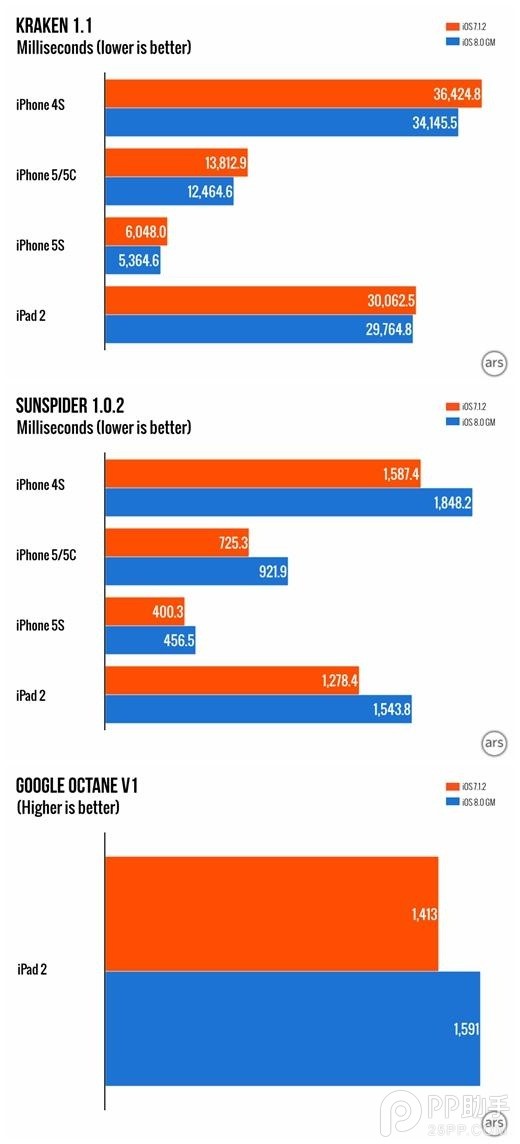 让人意外的是,从跑分测试来看,iOS8的浏览器性能要比iOS7有所提升。在Kraken测试中,iOS8的表现比iOS7稍差一些,但前者在SunSpider测试当中的得分却超越了iOS7。iPad2在升级iOS8之后无法正常运行GoogleOctanev2,但在运行v1版本的测试时,iOS8的成绩同样稍好于iOS7。