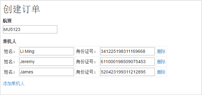 要求能够动态地添加和删除乘机人,最终提交表单后乘机人信息要填充到视图模型中的一个数组或集合属性中,以方便我们进行后续业务处理。