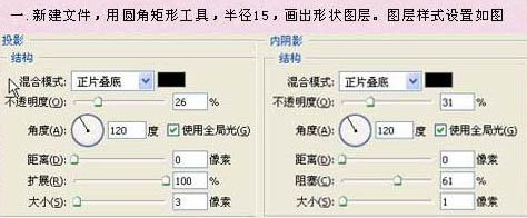 1、新建一个大小自定的文件,选择圆角矩形工具,半径设置为15像素,前景颜色设置为蓝色,拉出一个圆角矩形,然后双击图层调出图层样式,参数设置如下图。