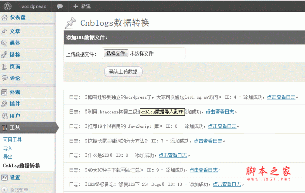 后台开启插件后,可以在“工具”中找到“Cnblogs数据转换”,进入;