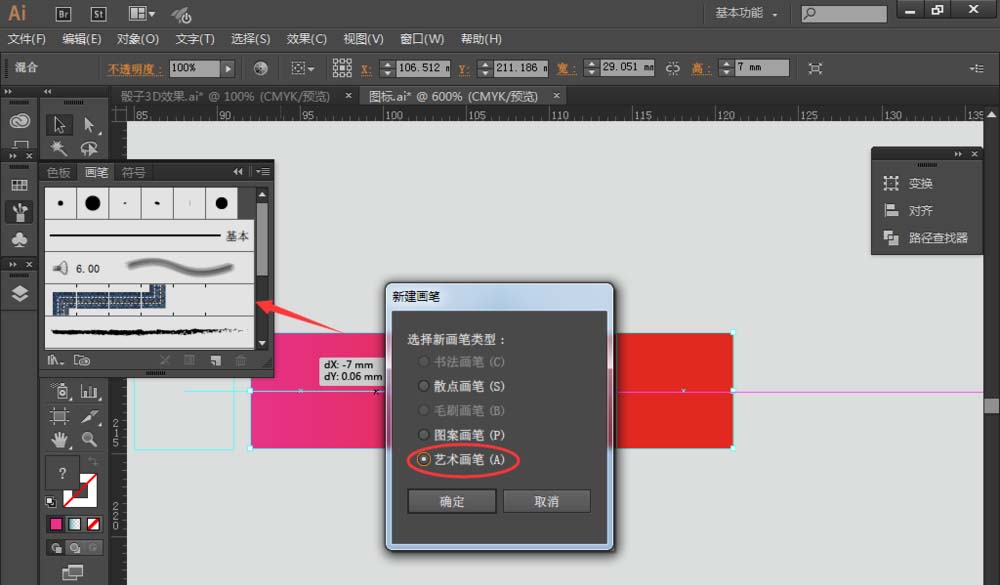 3、打开【画笔画板】,将上面创建的混合组拖到【笔刷面板】,创建一个新的默认设置的艺术笔刷。如图: