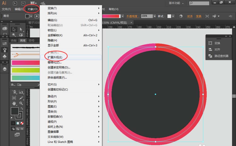 2、然后找到【对象】选择【扩展外观】,将笔刷描边变为形状;单击【鼠标右键】,选择【取消编组】,将圆和圆的彩色(后面简称圆环)描边分离开来。