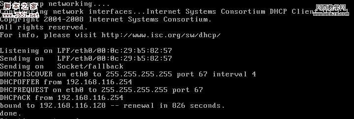 bound to 192.168.116.128 -- renewal in 826 seconds //已绑定,826秒应该是0.5T,也就是IP租用期的一半,到时间就再次发送请求更新租用期