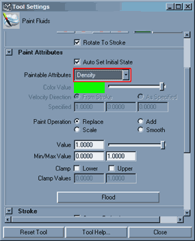弹出流体笔刷属性框,将 Paintable Attributes 选为 Density
