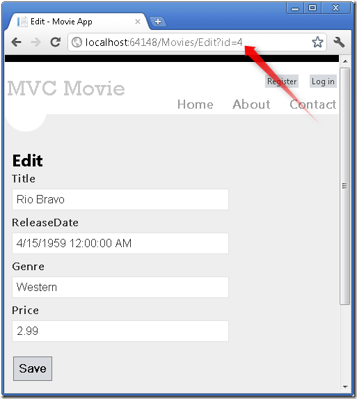 您还可以使用QueryString来传递操作方法的参数。例如,URL: http://localhost:xxxxx/Movies/Edit?ID=4还会将参数ID为 4的请求传递给Movies控制器的Edit操作方法。
