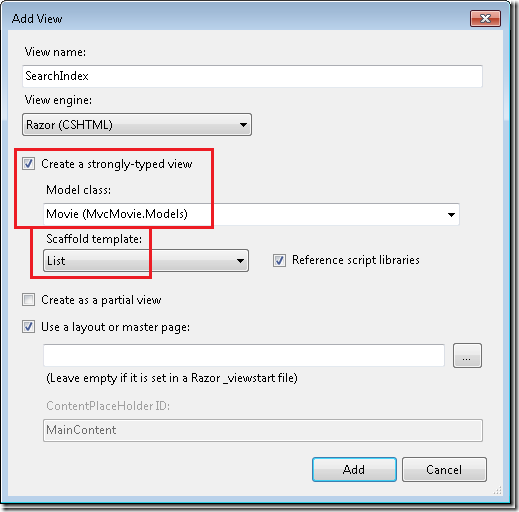 现在,您可以实现SearchIndex视图并将其显示给用户。在SearchIndex方法内单击右键,然后单击添加视图。在添加视图对话框中,指定你要将Movie对象传递给视图模板作为其模型类。在框架模板列表中,选择列表,然后单击添加.