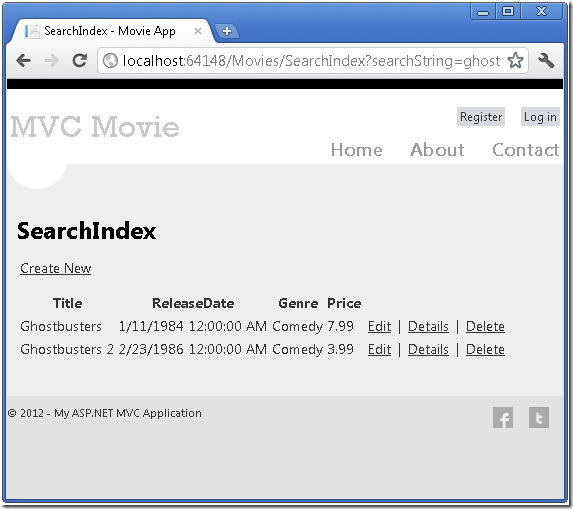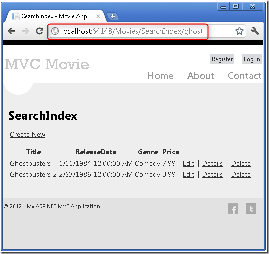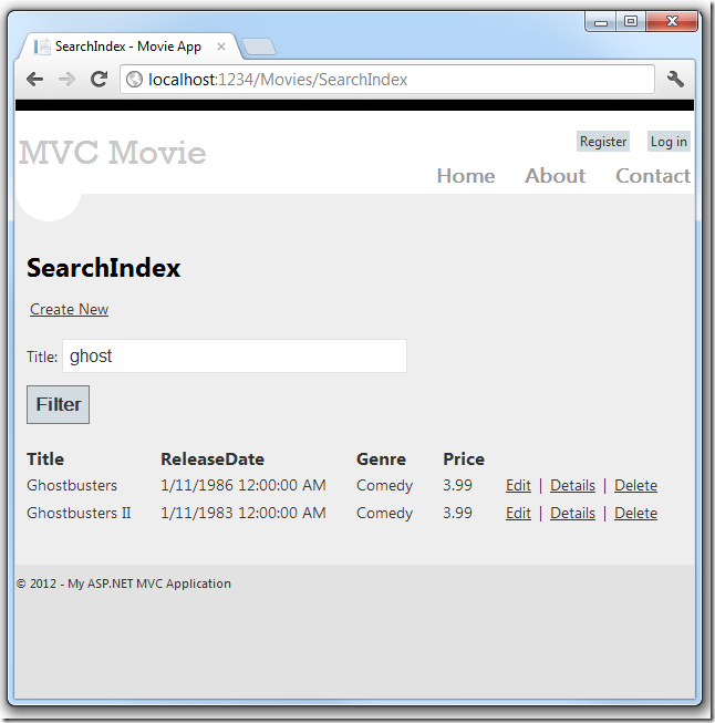运行该应用程序,然后转到 /Movies/SearchIndex。追加查询字符串到URL如?searchString=ghost。显示已筛选的电影。