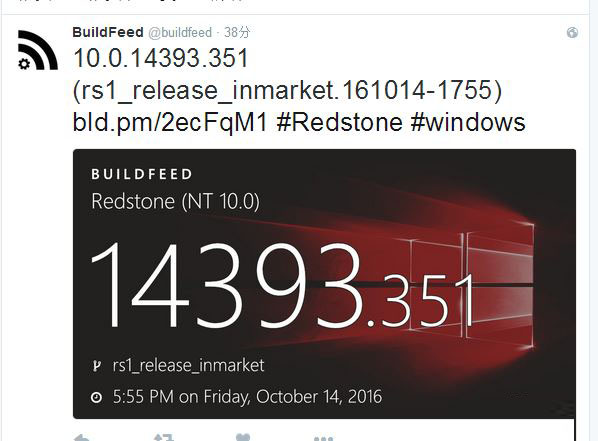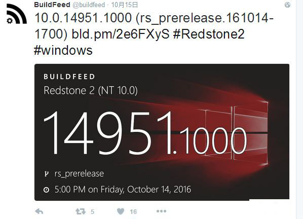 微软目前正在紧锣密鼓地开发Win10 Mobile/PC Redstone 2预览版,最近的版本已经开始增加新功能。根据BuildFeed跟踪到的信息,目前微软编译的最新Redstone 2预览版是Build 14951.1000,编译于2016年10月14日周五。此外,Win10 Mobile/PC周年更新的下个补丁也已经曝光,版本号是14393.351,也是编译于10月14日。根据Buildfeed提供的信息,这个版本为市场发布版本。
