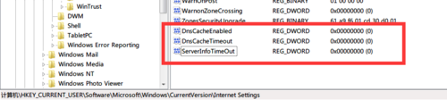 新建:DnsCacheEnabled 0x0 (REG_DWORD)DnsCacheTimeout 0x0 (REG_DWORD)ServerInfoTimeOut 0x0 (REG_DWORD)这三个DWORD。