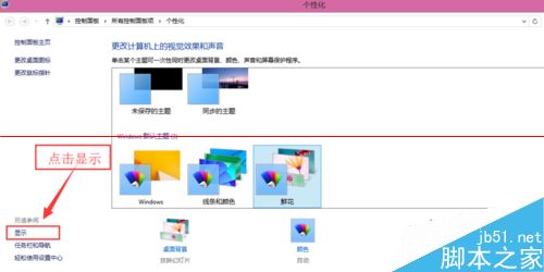 第二步、单击个性化后你会进入,你会进入个性化设置界面。在这个界面中,在靠左边的地方找到“显示”按钮,并点击进入。具体操作如图所示