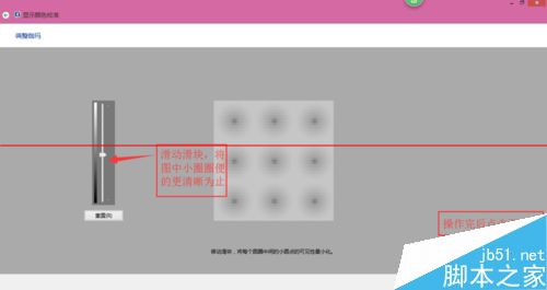第四步、当你进入”调整伽马“界面后,你不要感到迷惑,也不需要你明白什么是伽马。你需要调整界面中的滑块,是界面中的九个小圆圈变得更清晰就行。然后点击”下一步“。具体操作如图所示