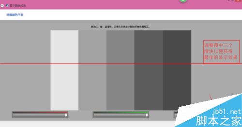 第六步、接下来是调整”颜色平衡“。当你进入这个界面后,你会发现界面下方有三个滑块,这里需要你调整三个滑块来调整屏幕显示的颜色。在这一步你可以选用一款显示效果的手机作为参照。设置完后点击“下一步”。具体操作如图所示